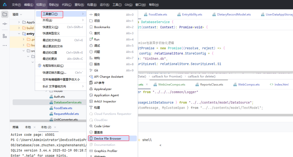 在【视图】->【工具窗口】->【Device File Browser】,查找db文件路径。