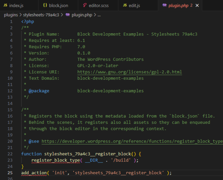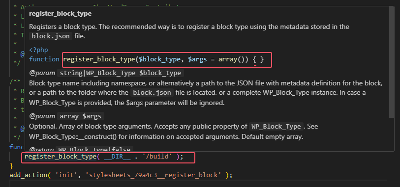 VS Code 中用于 PHP 代码提示的插件(如 PHP Intelephense),需要 “知道 WordPress 核心函数的定义”(比如 register_block_type()、add_action() 这些函数在哪里声明),才能正确提供补全、避免 “未定义函数” 的错误提示。