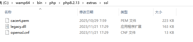 3:将cacert.pem 到指定路径(无则新增):C:\wamp64\bin\php\php8.2.13\extras\ssl